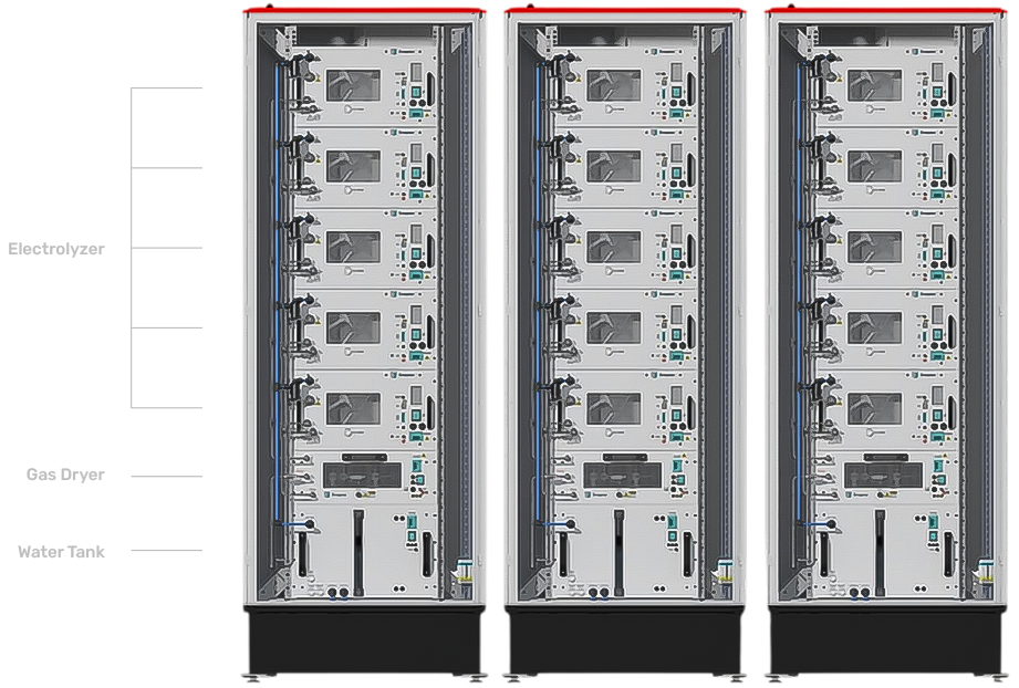 A flexible system for streamlined deployment of green Hydrogen projects, customizable from 70kW to 480kW.